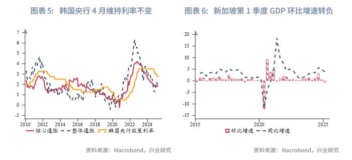 东南亚:新加坡第一季度经济增长弱于预期,增速从上季度的扩张0.5%转为2025年第一季度的萎缩0.8%,远弱于预期值0.4%。在4月的货币政策声明中,新加坡金管局连续第二次略微降低新加坡元名义有效汇率政策区间的斜率,政策区间的宽度和中心水平保持不变。金管局将通胀预期从1%-2%下调至0.5%-1.5%,重申经济增长预期从1%-3%下调至0%-2%,强调美国关税政策增添经济下行风险,国内消费持续疲软,通胀已经出现明显降温。
