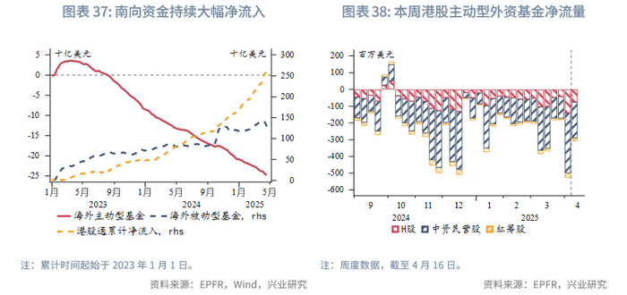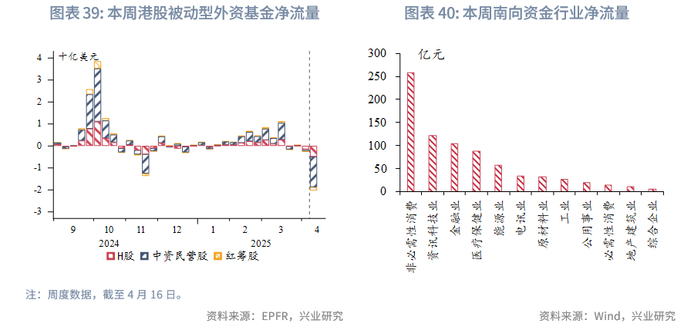 随着“对等关税”推迟、避险情绪降温,本周恒生指数震荡上行,南向资金净流入幅度较前一周下降,净流入232亿港元,被动型外资净流出幅度大幅上升。