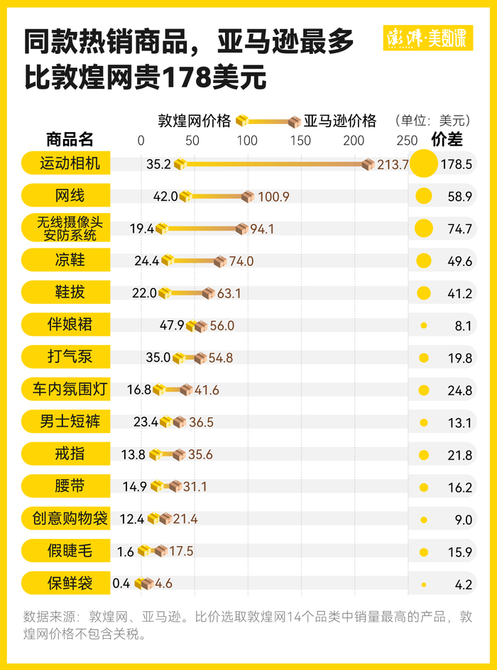 中国商品巨大的价格优势不仅是在宠物用品上。对比敦煌网、亚马逊同类热销商品的价格可以看到,在14个品类销量最高的商品中,亚马逊的价格平均比敦煌网要高出近40美元。一款在亚马逊上售价为213.7美元的运动相机,在敦煌网上可以买到6个。