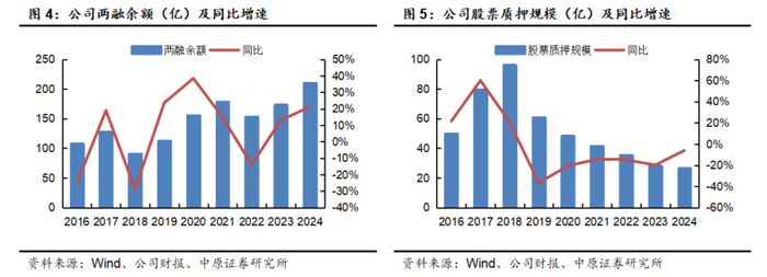 融资融券业务方面,截至报告期末,公司两融余额为209.55亿元,同比+21.16%;市占率1.1%,创近5年新高。报告期内公司实现融出资金利息收入9.75亿元,同比-2.55%。
