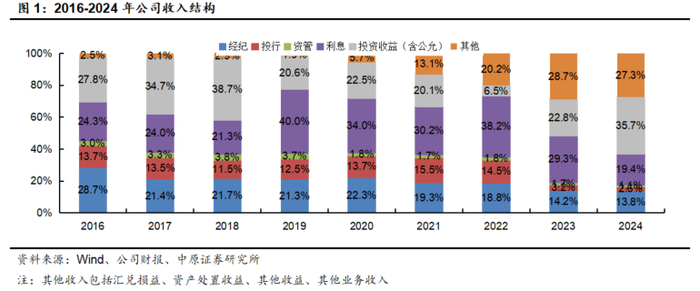 2024年公司经纪、投行、资管、利息、投资收益(含公允价值变动)和其他业务净收入占比分别为13.8%、2.6%、1.1%、19.4%、35.7%、27.3%,2023年分别为14.2%、3.2%、1.7%、29.3%、22.8%、28.7%。
