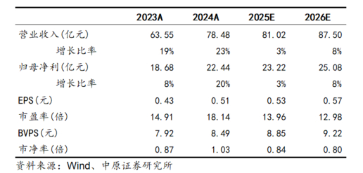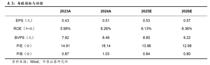 预计公司2025年、2026年EPS分别为0.53元、0.57元,BVPS分别为8.85元、9.22元,按4月18日收盘价7.40元计算,对应P/B分别为0.84倍、0.80倍,维持“增持”的投资评级。