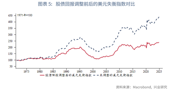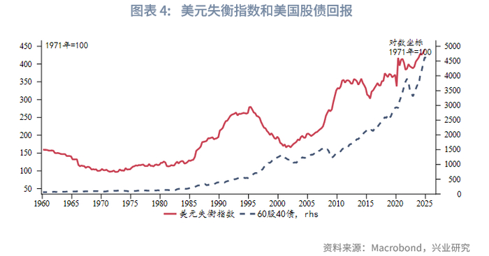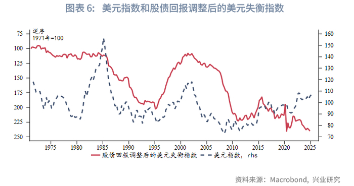 上文我们在分析美元机制时提及,美元失衡的副产品便是创造了大量美元流动性,进而催生了大量美元资产配置需求,造就了美国股、债长期牛市。以标普500和美国10Y国债作为基准构建60%股+40%债的资产组合,可以发现组合的累计收益和美元失衡指数同步攀升。因此可将美国股、债的回报看作对于美元体系失衡的补偿。将美元失衡指数除以美国股债组合的对数回报,求得“股债回报调整后的美元失衡指数”。调整后的美元失衡指数读数明显降低,当前接近2020年的历史最高水平,高于次贷危机时期水平。我们认为调整后的美元失衡指数对于美元体系的描述更加全面,也更符合金融市场实际。