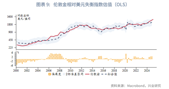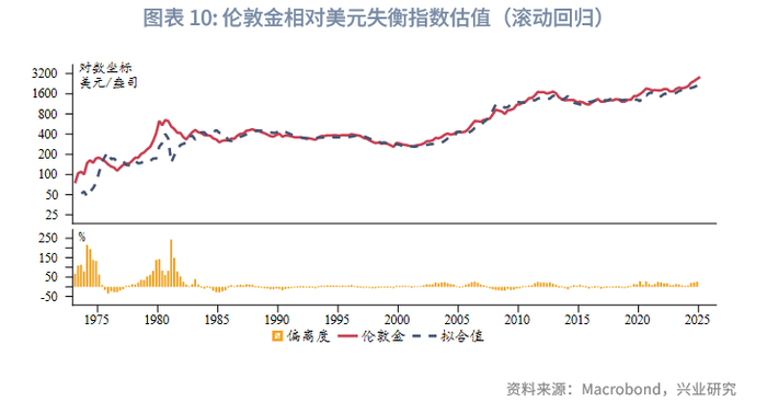 在1971~1980年伦敦金和调整后的美元失衡指数有较强的正相关性,随后美元体系逐步稳固,两者的相关性减弱。在2000年后,两者的正相关性再度明显增强。即美元失衡加剧时,金价走高;反之,金价走低。与美元指数类似的,也对伦敦金分别进行2000年以来的OLS回归和1971年以来的20个季度(5年)滚动回归。OLS回归显示,2024年末伦敦金小幅高估约2%,低于此前牛市中出现的超过5%的高估幅度。滚动回归显示,2024年末伦敦金高估约26%,接近2000年后牛市中的高估峰值,但远低于1970~1980年代货币体系转换时期的高估程度,当时最大高估程度超过200%。