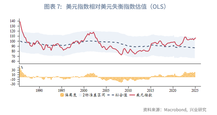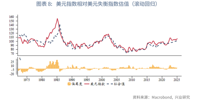 1985年以来,美元指数和调整后的美元失衡指数呈现负相关性,即美元失衡加剧时美元贬值,反之,美元倾向于升值。以1985年以来时间序列进行OLS回归,可以发现美元指数长期在2个标准差区间内运行,触及区间上限(高估)或下限(低估)时会出现反向修正。至2024年末,美元指数触及区间上限,高估约21%。2025年1月至今,美元指数最大跌幅约10%,一定程度修复了高估。若自1971年以来进行20个季度(5年)滚动回归,美元指数高估程度有所下降,2024年末高估约4%,低于次贷危机和2020年疫情时的高估水平。