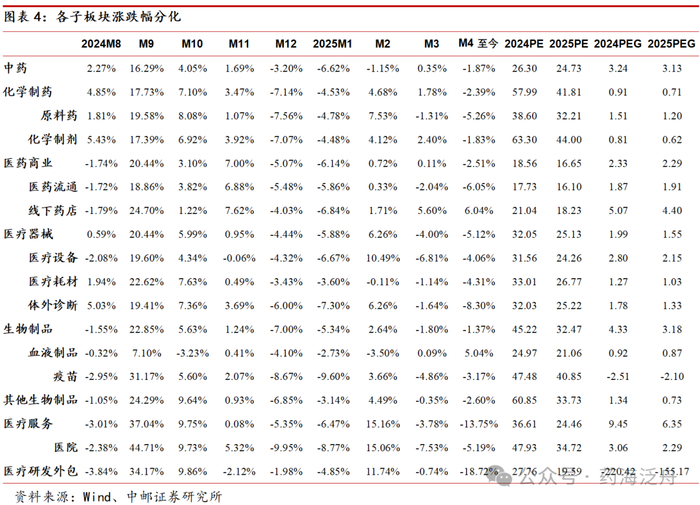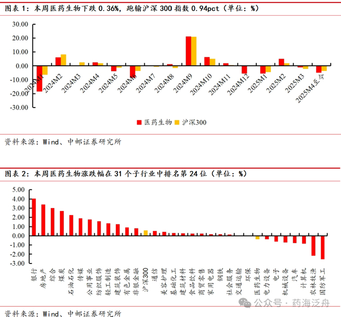 本周医药生物下跌0.36%,跑输沪深300指数0.94pct,在31个子行业中排名第24位。2025年4月至今医药生物下跌4.81%,跑输沪深300指数1.17pct。