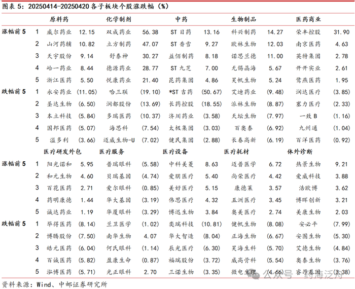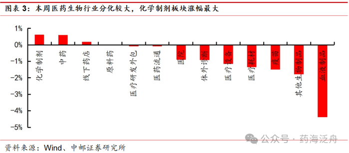 本周化学制剂板块涨幅最大,上涨0.62%;中药板块上涨0.6%,线下药店板块上涨0.19%,原料药板块上涨0%,医疗研发外包板块下跌0.09%;血液制品板块跌幅最大,下跌4.39%,其他生物制品板块下跌1.78%,疫苗板块下跌1.49%,医疗耗材板块下跌1.35%,医疗设备板块下跌1.16%。