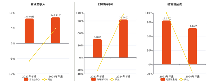 公司营业总收入为147.71亿元。归母净利润为16.94亿元。经营活动现金净流入为11.26亿元,较去年同报告期经营活动现金净流入减少2.37亿元,同比较去年同期下降17.36%。