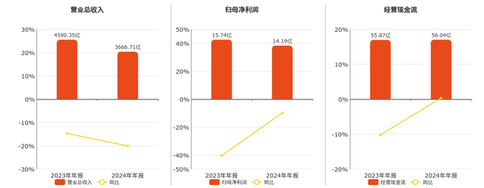 公司营业总收入为3666.71亿元,较去年同报告期营业总收入减少923.65亿元,同比较去年同期下降20.12%。归母净利润为14.19亿元,较去年同报告期归母净利润减少1.55亿元,同比较去年同期下降9.86%。经营活动现金净流入为56.04亿元,较去年同报告期经营活动现金净流入增加1789.51万元,同比较去年同期上涨0.32%。