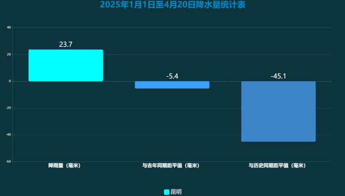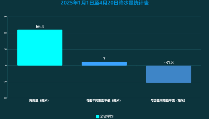 2025年以来(1月1日至4月20日),据国家气象观测站监测,全省平均降水量66.4毫米,较常年同期偏少31.8毫米(偏少32.4%),比去年同期偏多7.0毫米(偏多11.8%)。全省平均气温13.4℃,与常年同期持平,比去年同期偏低1.4℃。