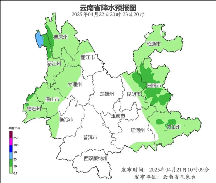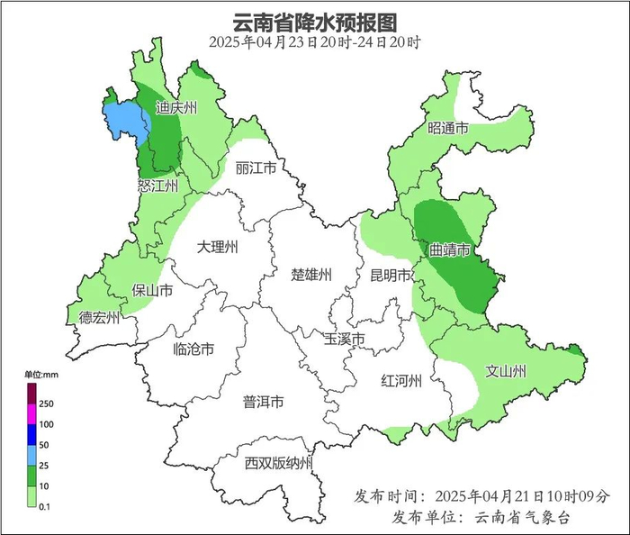 4月23日至24日受高原南侧偏西急流与冷空气共同影响,西北部边缘、东部有中雨局部大雨,其中怒江州北部有中到大雨局部暴雨。