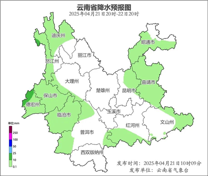 迪庆州、怒江州、保山市、德宏州、临沧市、普洱市西部、红河州南部、文山州东部、曲靖市、昆明市东北部、昭通市多云有阵雨局部中雨、大雨,其他地区晴间多云。