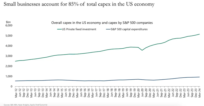 其次,小型企业的投资也比大型企业多。美国经济分析局(Bureau of Economic Analysis)的数据显示,2024年第一季度,美国私人固定投资约为4.2万亿美元。相比之下,根据阿波罗的分析,标准普尔500指数成分股公司当季的资本支出在1万亿美元左右徘徊。