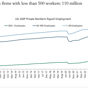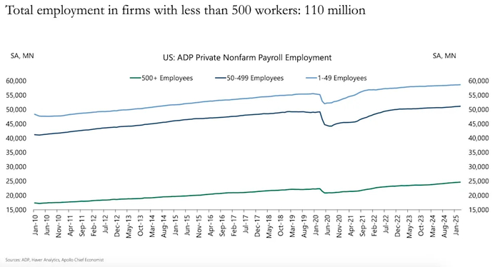 首先,小企业提供了美国大部分的就业机会。截至今年1月,员工人数少于500人的企业创造了约1.1亿个就业岗位。阿波罗的分析显示,这大约是员工人数超过500人的企业的四倍。