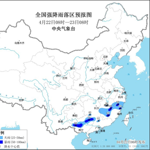 中央气象台4月22日06时继续发布暴雨蓝色预警、强对流天气蓝色预警:预计,4月22日08时至23日08时,江西中南部、浙江南部、福建西部和北部、广西西部和北部、广东北部等地有大雨,其中,江西东南部、浙江西南部、福建西部和东北部、广西西部和东北部等地部分地区有暴雨(50~80毫米)(见图1)。上述部分地区伴有短时强降水(最大小时降雨量30~50毫米,局地可超过70毫米)。江南东部、华南西部等地的部分地区将有8级以上雷暴大风或冰雹天气,其中,广西西部和东北部等地的部分地区将有10级以上雷暴大风(见图2)。