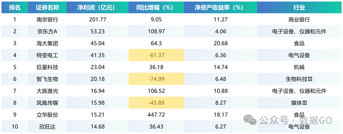 从净利润来看,当日披露年报公司中,16家净利润超10亿元。南京银行、京东方A、海大集团排名居前,全年净利润分别为201.77亿元、53.23亿元、45.04亿元。