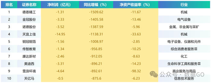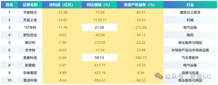 从净亏损来看,当日披露年报公司中,3家公司净亏损超10亿元,节能铁汉、天宜上佳、*ST中利排名居前,净亏损金额分别为25.96亿元、14.95亿元、11.74亿元。