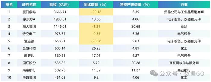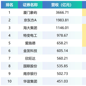 从营收来看,当日披露年报公司中,51家营收超50亿元,厦门象屿、京东方A、海大集团排名居前,全年营收分别为3666.71亿元、1983.81亿元、1146.01亿元。