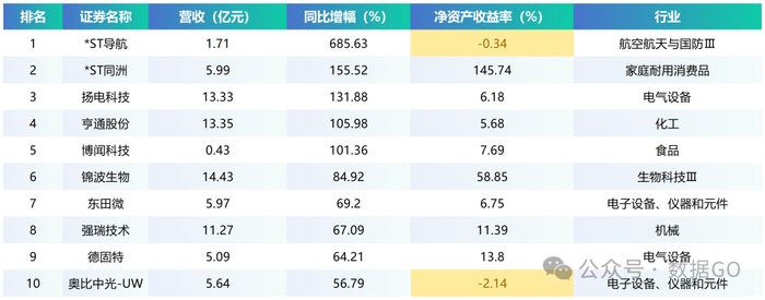 从营收增幅来看,当日披露年报公司中,12家公司营收增幅超50%,*ST导航、*ST同洲、扬电科技增幅居前,全年增幅分别为685.63%、155.52%、131.88%。