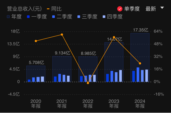 年报显示,该公司2024年实现营业收入17.35亿元,同比增长23.33%;实现归母净利润8.83亿元,同比增长21.10%,均创其历史新高。