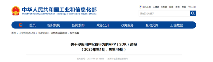 关于侵害用户权益行为的APP(SDK)通报(2025年第1批,总第46批)