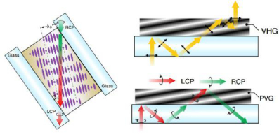 该AR眼镜的耦入耦出结构由一层2μm的倾斜胆甾相液晶层构成。胆甾相液晶的周期性螺旋结构形成布拉格光栅,使得光线入射到该液晶层时,将依据布拉格公式发生偏转。但当入射角接近平行于布拉格反射面时,光线不再发生偏转而是直接透过,此时光栅层的作用接近于波片。因此当波片厚度正好满足半波条件时,入射的右旋圆偏光将被转换为左旋偏振光,研究者称这一现象为反常偏振转换现象。[3]