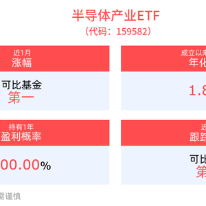 截至4月21日,半导体产业ETF近1年净值上涨49.27%,指数股票型基金排名118/2730,居于前4.32%。从收益能力看,截至2025年4月21日,半导体产业ETF自成立以来,最高单月回报为20.82%,最长连涨月数为3个月,最长连涨涨幅为45.46%,涨跌月数比为6/5,上涨月份平均收益率为10.57%,历史持有1年盈利概率为100.00%。截至2025年4月21日,半导体产业ETF成立以来超越基准年化收益为1.84%。