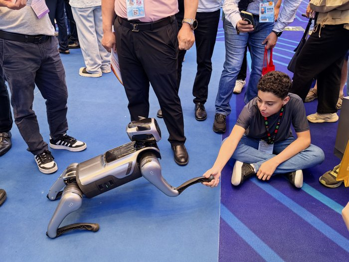 另一家具身智能公司魔法原子的展区也吸引了不少客商,其开发的机器狗能做出摇头、翻跟斗、卧倒等动作,并能与人类进行握手等简单互动。魔法原子员工介绍道,这款机器狗目前仍在迭代中,正在开发导盲犬的用途。谈话间,已有外国客商上前询价。
