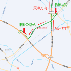 京哈高速双向去往津蓟高速车辆,可由津围收费站(位于京哈高速K80公里处)出站,途径津围公路至津蓟高速物流城收费站(位于津蓟高速K71公里处)驶入津蓟高速。