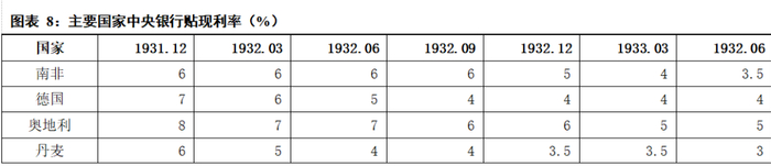 放弃金本位制度后,各国货币政策总体转向宽松,利率不断下调。货币宽松政策始于1932年2月英格兰银行将贴现率从6%降至5%。此后中央银行贴现率普遍且几乎持续地降低。