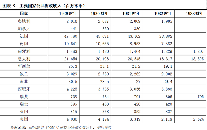 其五,从贸易出口下行到各国提高国内税收以应对财政收支压力。当时各国主要采用金本位,财政逆周期扩张的操作并不流行。出口受挫影响总量经济,财政收入随之下行。为了避免财政收入下行带来的收支压力过大,多国纷纷引入新税种(如营业税、消费税等),并收紧了税收征管方法,客观上抬升国内税收。这能够一定程度上缓解财政赤字压力,但终不改财政赤字转多的事实。