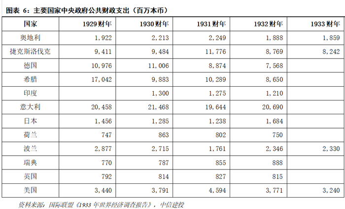 财政支出普遍收缩。古典经济学盛行之下,政府逆周期扩大支出的国家较少,结构上普通行政开支明显下降,投资开支和公共工程方面也削减了大量资金,但如国防和偿债支出具有刚性,基本维持不变,社会服务支出虽减少但也难大幅削减。