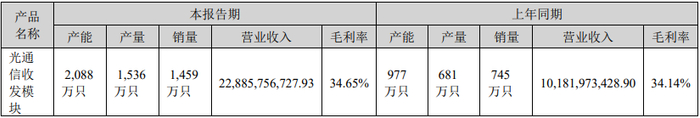 年报显示,中际旭创光模块产能由2023年的977万只上升至2024年的2,088万只,产能翻倍。产量增长不止一倍,增长125.55%。产能利用率由不到70%上升至73.56%。