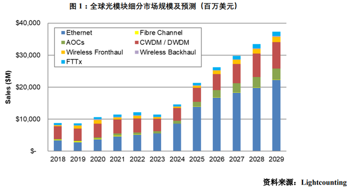 根据Lightcounting预测,光模块的全球市场规模在2024年至2029年或将以22%的CAGR (复合年均增长率)保持增长,2029年有望突破370亿美元,中国光模块市场规模有望达65亿美元。