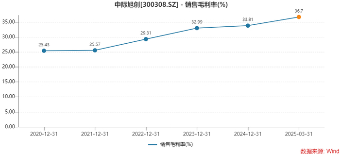 受此影响,中际旭创的毛利率连续四年在上升,2025年一季度公司销售毛利率创下了近11年的新高。