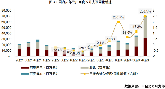 2024年四季度,国内三大互联网厂商(阿里巴巴、腾讯、百度)合计资本支出为707亿元,同比增速253.50%。