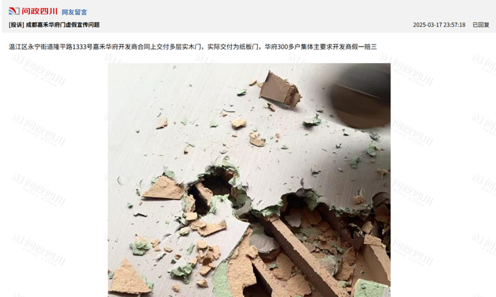 日前,有市民通过“问政四川”平台投诉成都嘉禾华府存在精装房虚假宣传、室内门质量等问题,投诉者称,“嘉禾华府开发商合同上交付多层实木门,实际交付为纸板门,华府300多户集体主要求开发商假一赔三”、“合同约定为波特意特,实物上商标为盼盼高端木门,疑似虚假宣传,要求有关部门对门供应商进行调查处理。”