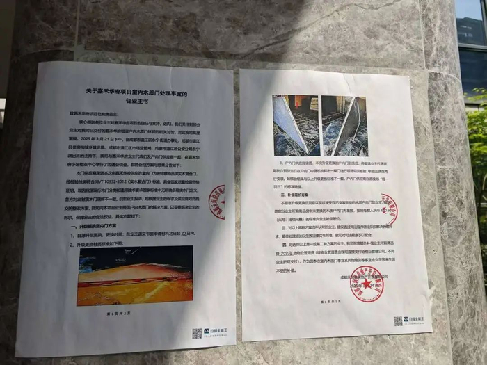 在业主们的指引下,记者在小区内看到了这封由开发商发布的《关于嘉禾华府项目室内木质门处理事宜的告业主书》。