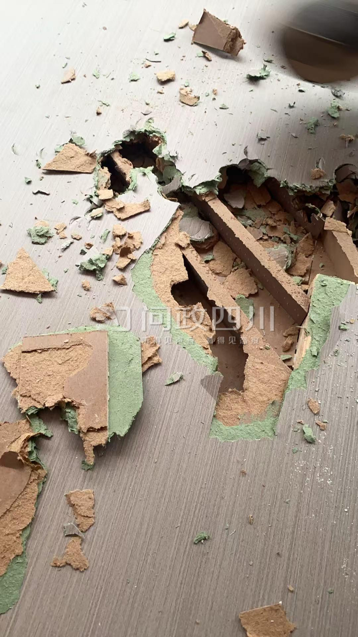 根据投诉者发布的图片来看,木门被敲碎后可看见里面的木头拼接稀疏,且门板实为贴皮。日前,封面新闻记者来到该楼盘进行走访调查。