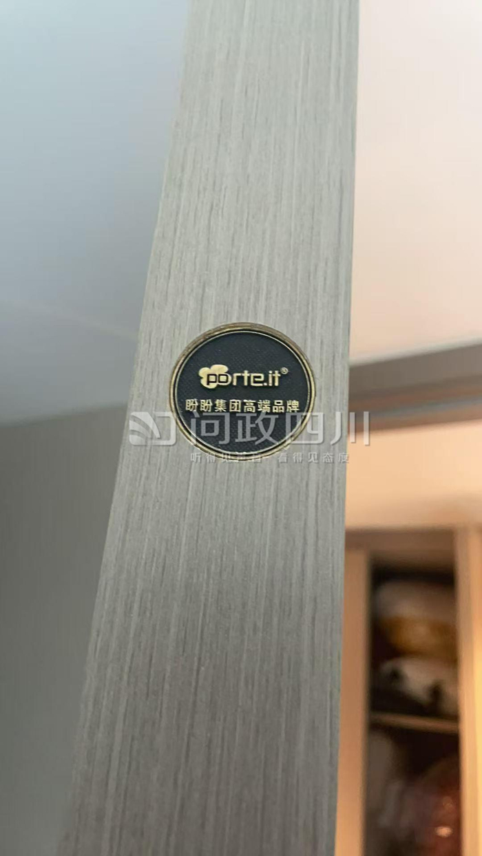 随后,封面新闻记者也跟随一位业主刘女士来到房间中查看,她购买的房子是精装修交付,项目宣传时装修标准约为3000元/㎡,配备了常规三大件。卧室的房门也就是被业主质疑的木门,记者随意推了几下,相比市面上的实木门,被业主们诟病的这扇门手感确实较轻。上面的品牌标识写着:盼盼集团高端品牌。