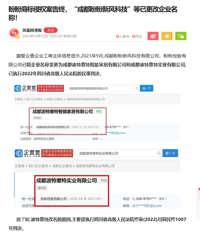 早在2022年,四川省高级人民法院就曾对一起商标侵权案作出过终审判决,认定“成都盼盼新风科技有限公司”、“盼盼控股有限公司”(后更名为:成都波特意特智能家居有限公司、成都波特意特实业有限公司)侵犯了盼盼安全门的商标权益,责令停止涉案商标侵权及不正当竞争行为,并向盼盼安全门赔偿。