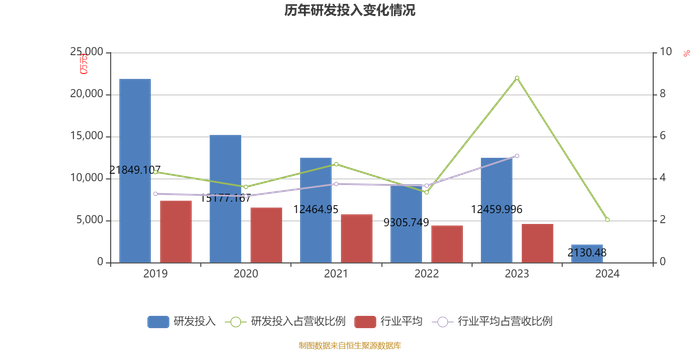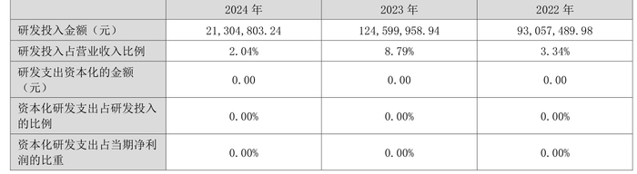 2024年全年,公司研发投入金额为2130.48万元,同比下降82.9%;研发投入占营业收入比例为2.04%,相比上年同期下降6.75个百分点。此外,公司全年研发投入资本化率为0%。