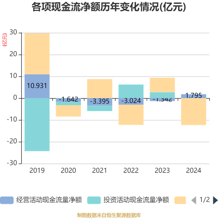 截至2024年,公司经营活动现金流净额为1.79亿元,同比增加3.14亿元;筹资活动现金流净额-12.37亿元,同比减少18.99亿元;投资活动现金流净额107.03万元,上年同期为2.71亿元。
