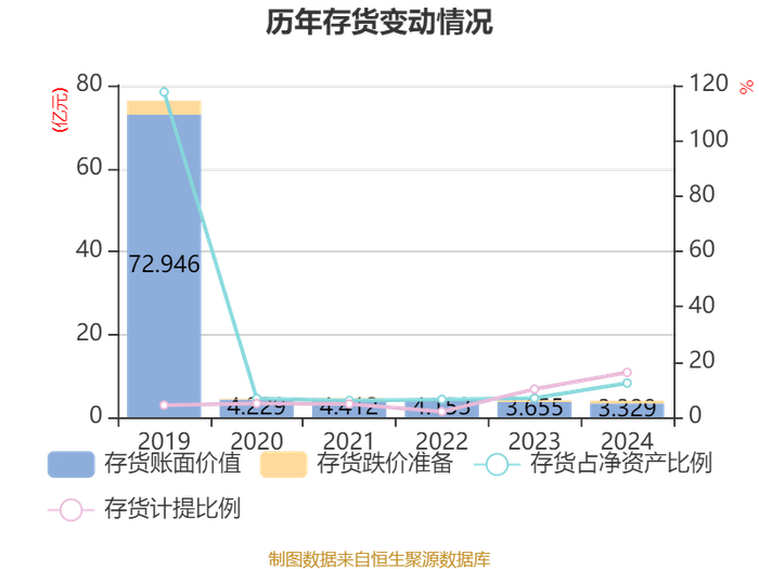 从存货变动来看,截至2024年末,公司存货账面价值为3.33亿元,占净资产的12.36%,较上年末减少3258.92万元。其中,存货跌价准备为6442.2万元,计提比例为16.21%。