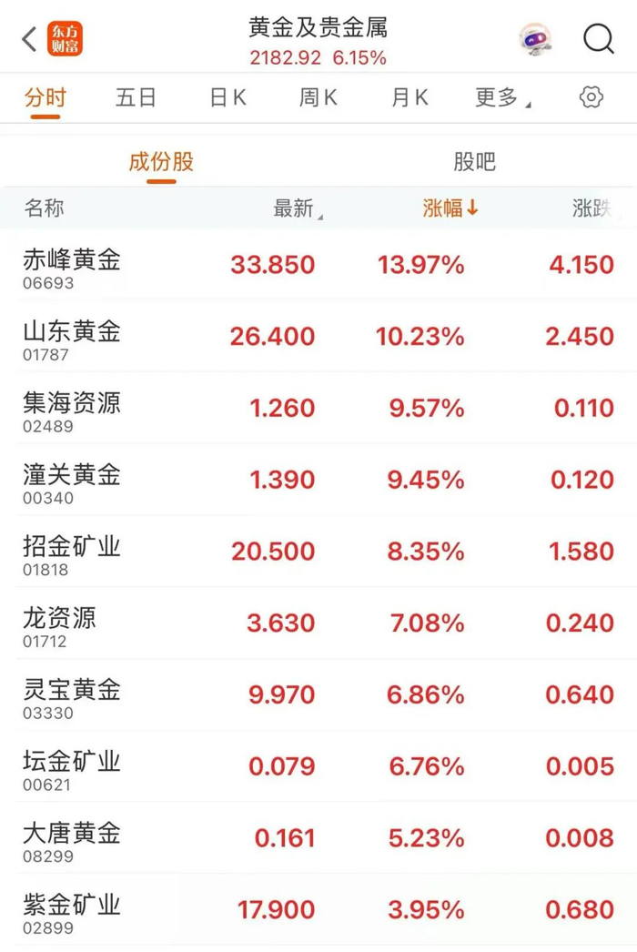 受国际金价持续创新高等利好驱动,黄金股也持续受益。继昨日近10只黄金股涨停后,今日上午,黄金股再度活跃,明牌珠宝盘中涨停,港股赤峰黄金涨超13%。