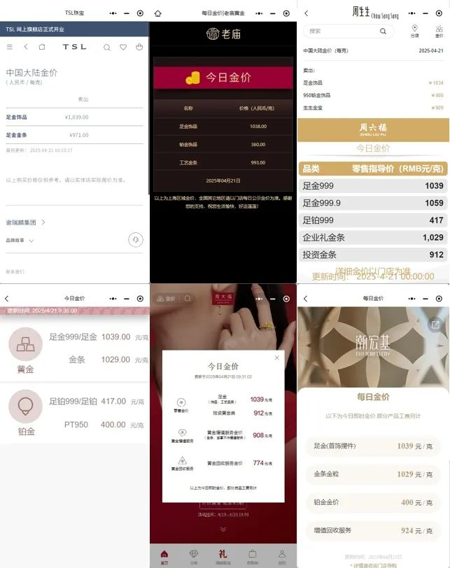 具体而言,4月22日,周大福足金(首饰、摆件类)、六福珠宝足金999/足金、潮宏基足金(首饰摆件)、谢瑞麟足金饰品、周六福足金999境内价格为1061元/克;老庙黄金上海区域足金饰品价格为1058元/克;周生生足金首饰境内价格为1052元/克。