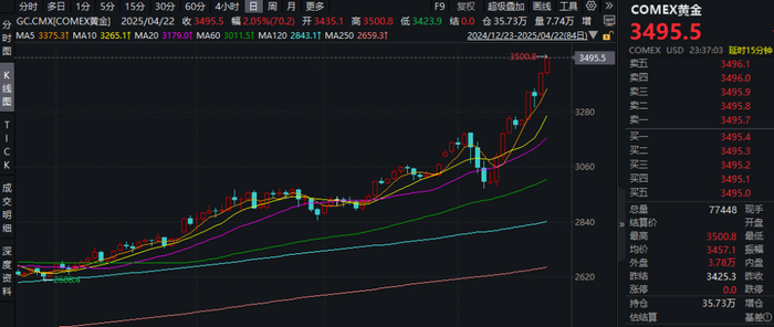 4月22日,国际、国内金价再创历史新高:现货黄金盘中突破3490美元/盎司水平,纽约期金率先突破重要整数关口3500美元/盎司;沪金期货主力合约涨逾4%至升破833元/克。截至发稿,上涨趋势仍在延续。