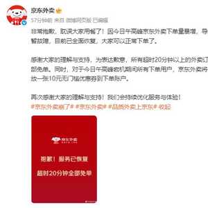 为表达歉意,所有已送达超时20分钟以上的外卖订单京东全部免单。同时,对于今日午高峰宕机期间所有下单用户,京东外卖将于今天额外发放一张10元无门槛优惠券到下单账户。