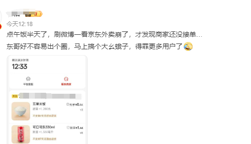 “11点17分下单,12点外卖还没到!显示商家接单,我打给商家,他说没有收到京东的单,问人工客服也没有回复。”“东子怎么回事?一个小时了还在等商家接单。”“让我苦等半小时,刚申请退款了,也一直不退给我。”