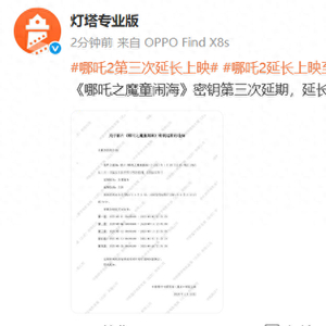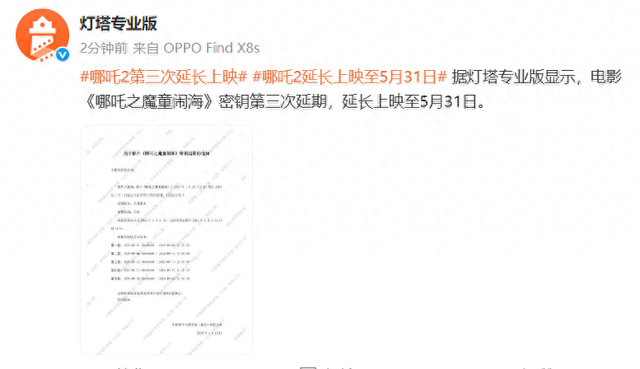 电影《哪吒之魔童闹海》密钥第三次延期,延长上映至5月31日 澎湃新闻 澎湃新闻官方账号 2025.04.2214:43 关注 据灯塔专业版显示,电影《哪吒之魔童闹海》密钥第三次延期,延长上映至5月31日。 (@灯塔专业版)